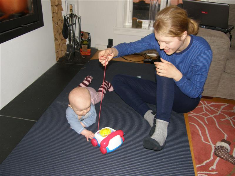 Borte bra som dei seier, men det var godt å koma heim att og. Eg fortsatte den gode trenden eg begynte på i London med å bevega meg langs golvet. De vei, England og teppegolv, teppegolv og krabbing, hånd i hanske! No ligg eg ikkje lenger og sutrar inne i stova om mammo og pappen er på kjøkkenet. Eg stikk hovduet innom eg!